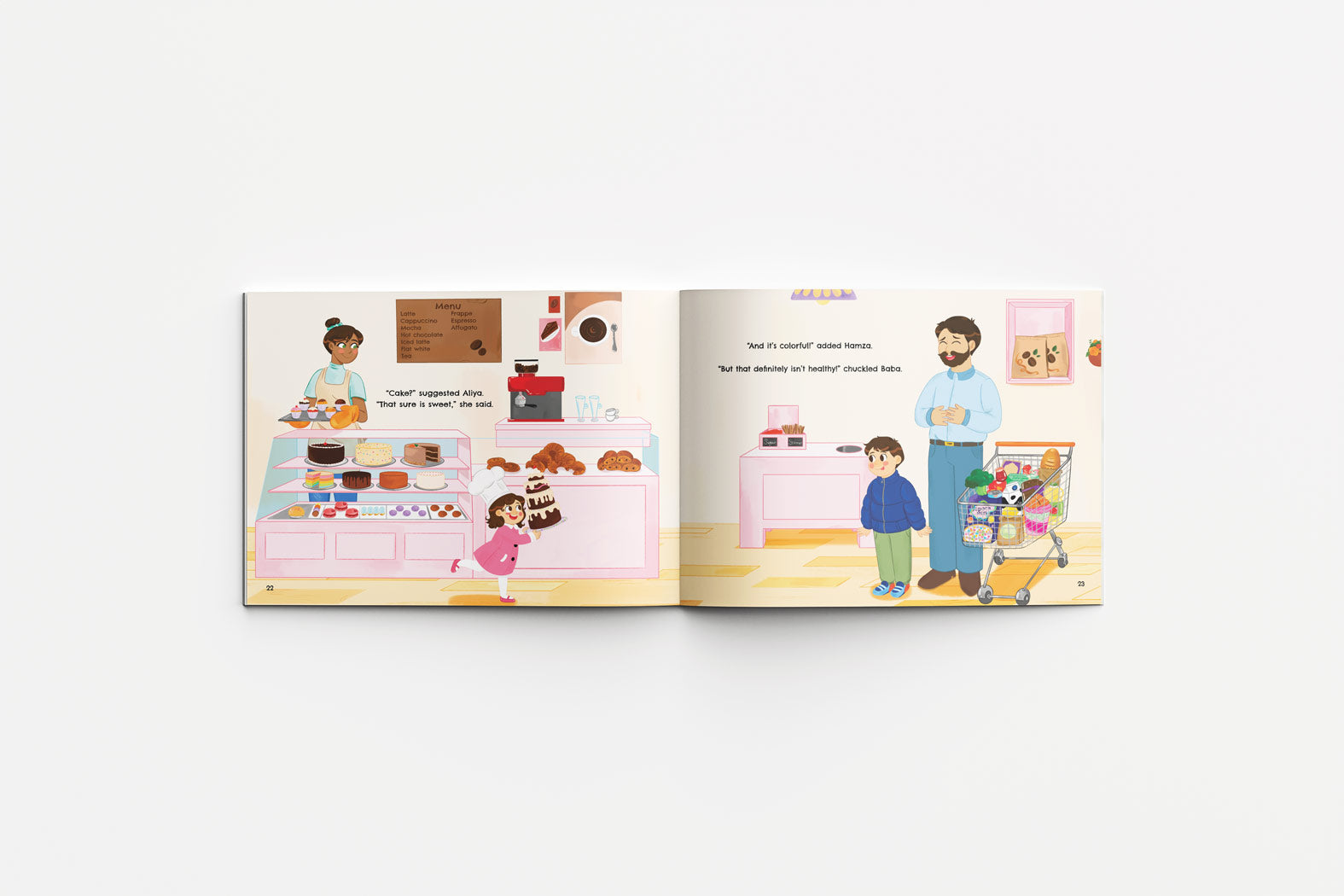 Hamza and Aliya join Baba on a trip to the grocery store. Each one of them has their own wishlist. Hamza wants to get something colorful. Aliya wants to get something sweet. And Baba wants to get something healthy. It’s tricky settling on just one thing, but Hamza and Aliya have a plan!