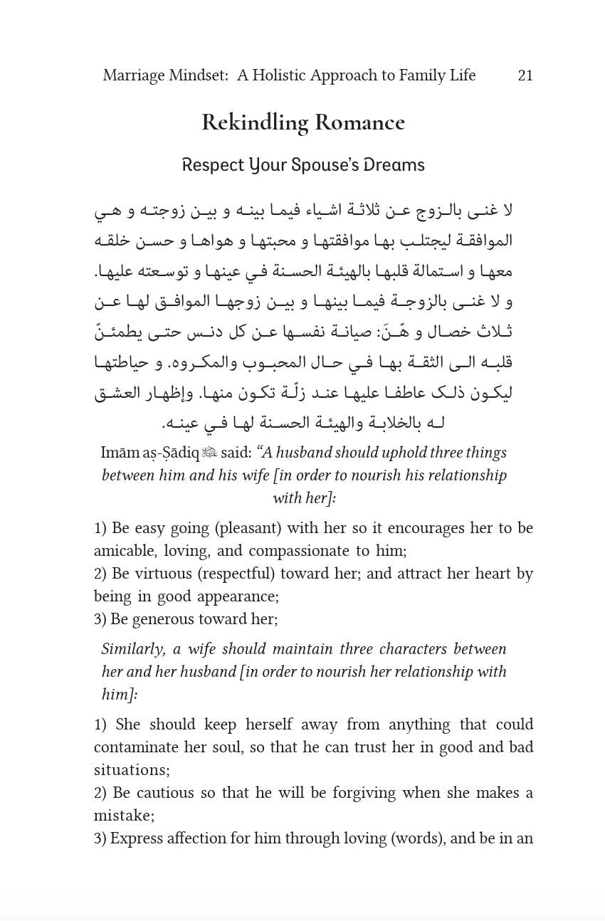 Drawing from the wisdom of the Ahlul Bayt (ʿa), our book serves as a guiding light for couples seeking to strengthen their marital bond. By embracing the teachings of the Noble Qurʾān and the immaculate family of Prophet Muḥammad (ṣ), readers are empowered to cultivate a marriage mindset that transcends the ordinary. From fostering unity and compassion within the family to becoming true ambassadors of Islam, our book offers invaluable insights for individuals and communities alike.