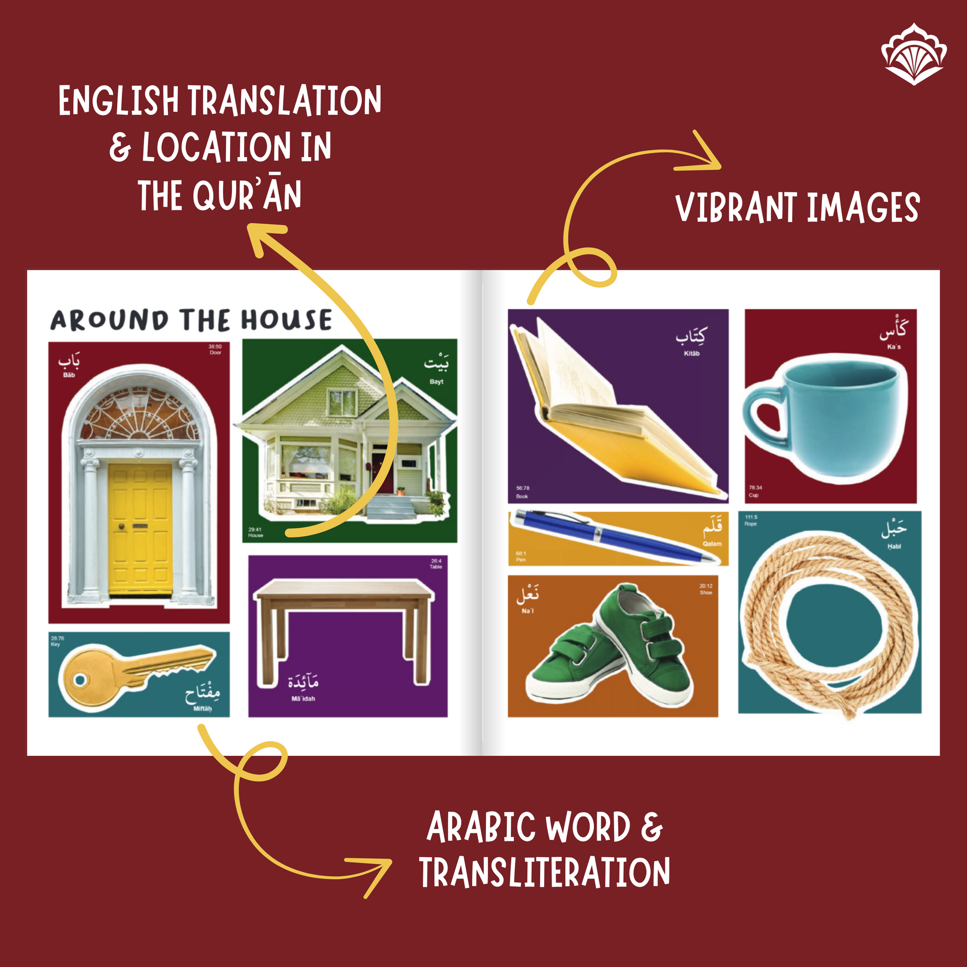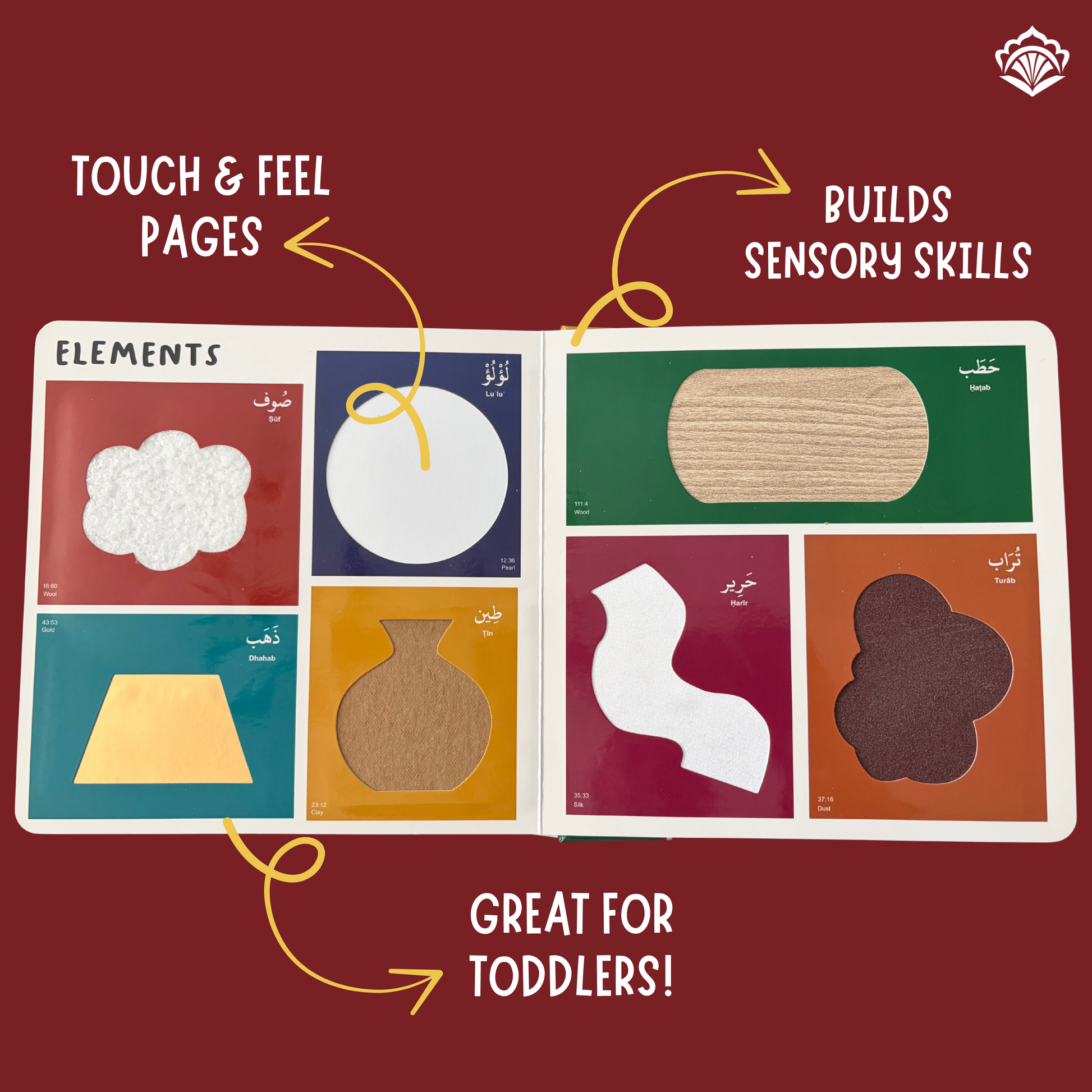 My 110 First Quranic Words is a board book that introduces your little one to the Qurʾān through engaging pictures, each word shown in Arabic with its meaning and location in the Qurʾān — and it even features a special touch-and-feel page for added fun!